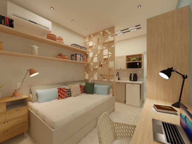 O dormitório é um ambiente aconchegante que se integra harmoniosamente à área social, otimizando o espaço. Um banheiro funcional, planejado com elegância e praticidade. A cozinha oferece funcionalidade sem abrir mão do design contemporâneo junto a um espaço dedicado para a lavanderia, incorporado de forma eficiente ao layout do studio.
