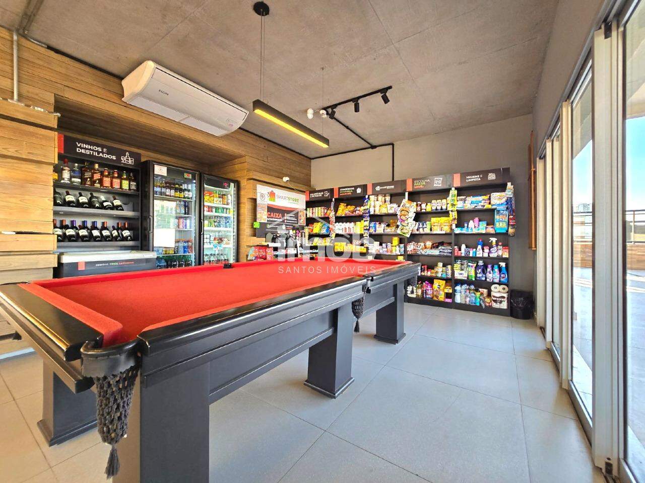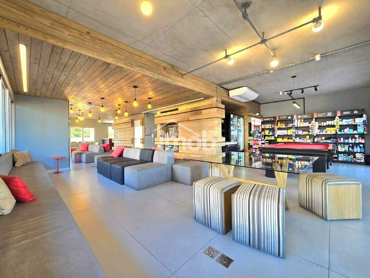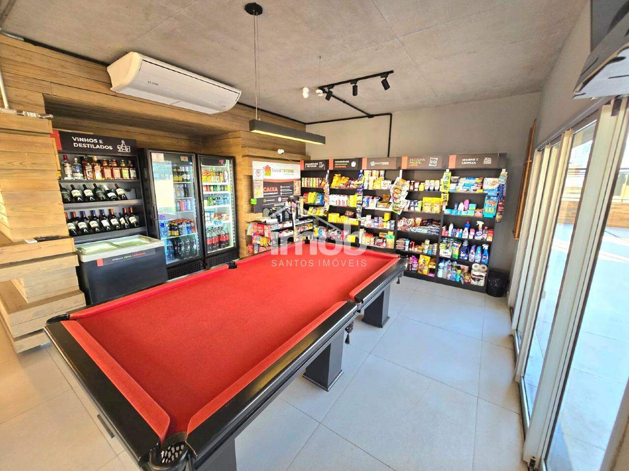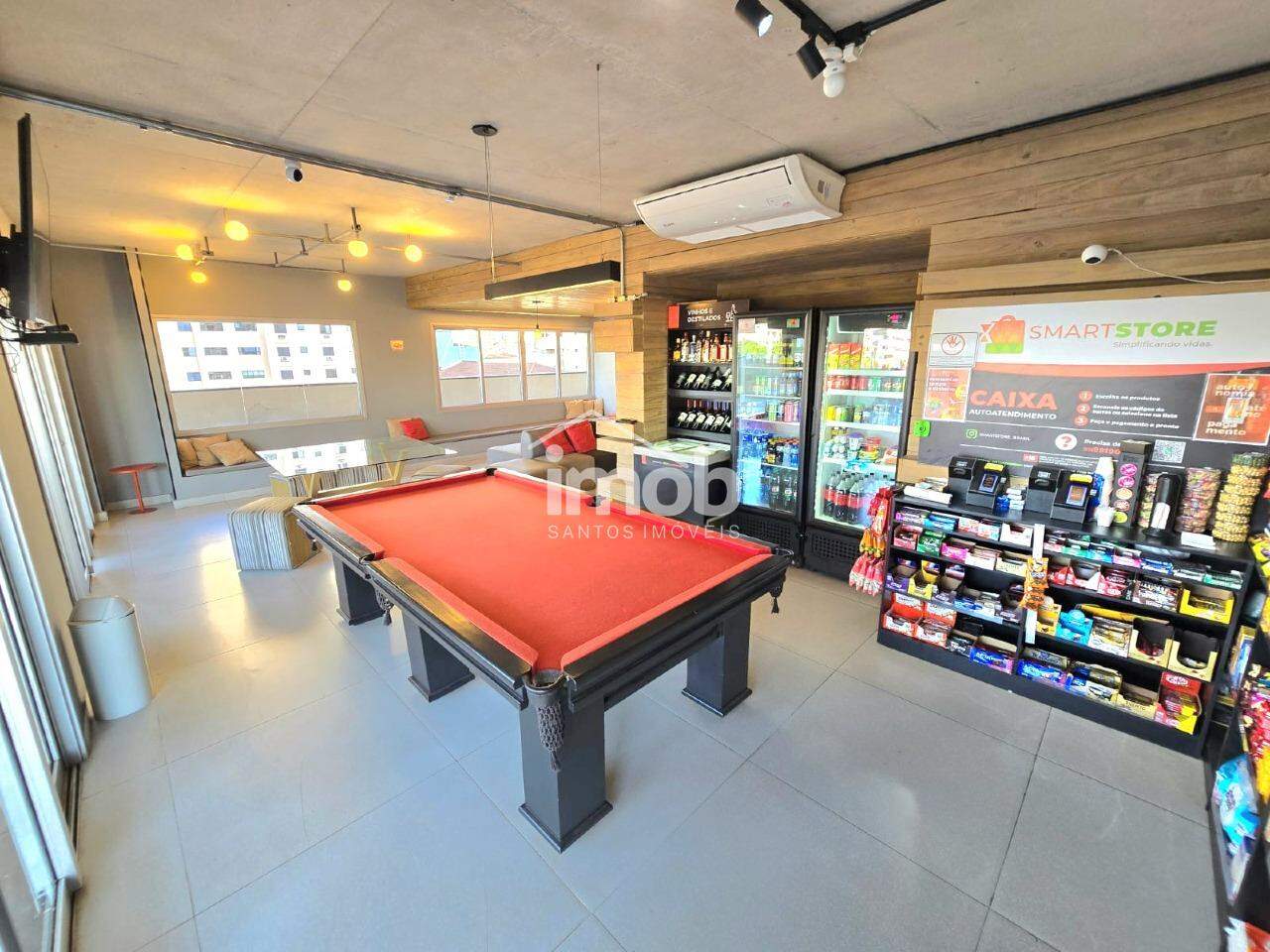 Área de lazer completa com piscina, churrasqueira, minimercado e academia.